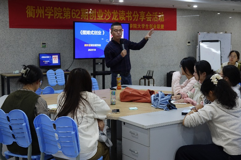 近日,衢州学院创新创业学院以复合型创业人才与地摊经济的价值探索为主题,成功举办第62期创业沙龙读书会。本次活动延续阅读赋能创新的核心理念,通过主题分享+案例解析+互动交流的多元形式,为在校师生带来一场关于创业思维与实战能力的深度对话。