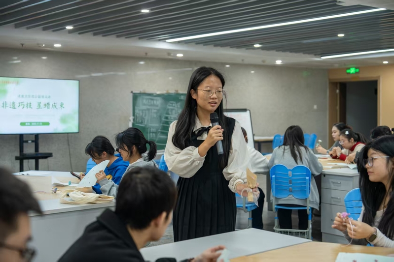 在实践环节,工作室团队成员、大学生创业联盟外联部部长、23小教1叶旺嘉现场演示了香薰花束的制作工艺,从香型调配、花材组合到造型设计进行细致指导。参与学生在动手实践中深入了解了文创产品的制作流程和技艺要点,亲身体验了从原材料到精美成品的创作全过程。