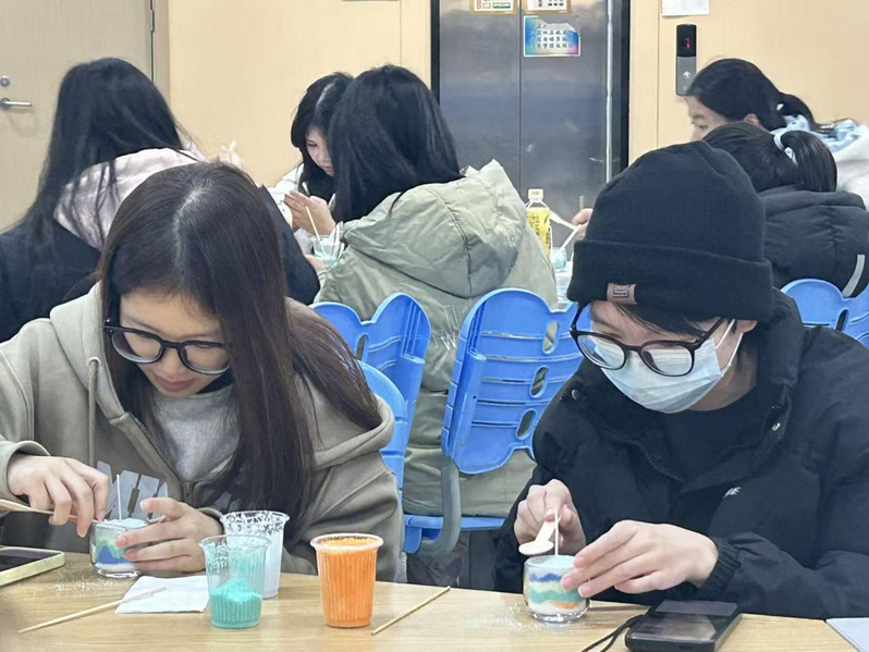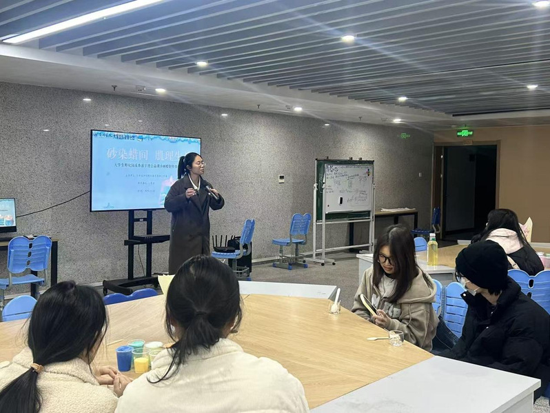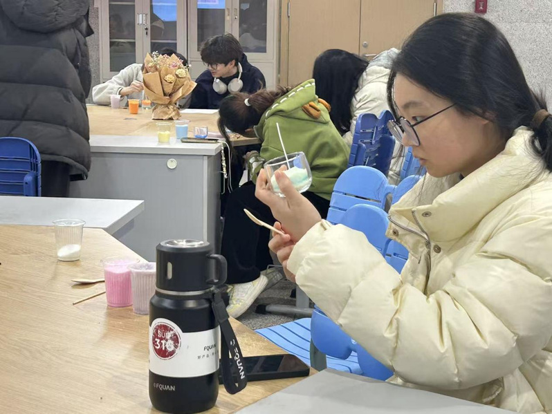 在教学环节,工作室负责人田湾湾(教师教育学院23数学2班)进行了专业示范与讲解。她围绕冰花蜡的色彩搭配、图案构思、塑形技法与层次营造等核心要点,一边操作演示,一边结合自身经验生动解析制作中的重点与难点,帮助同学们快速掌握创作要领。